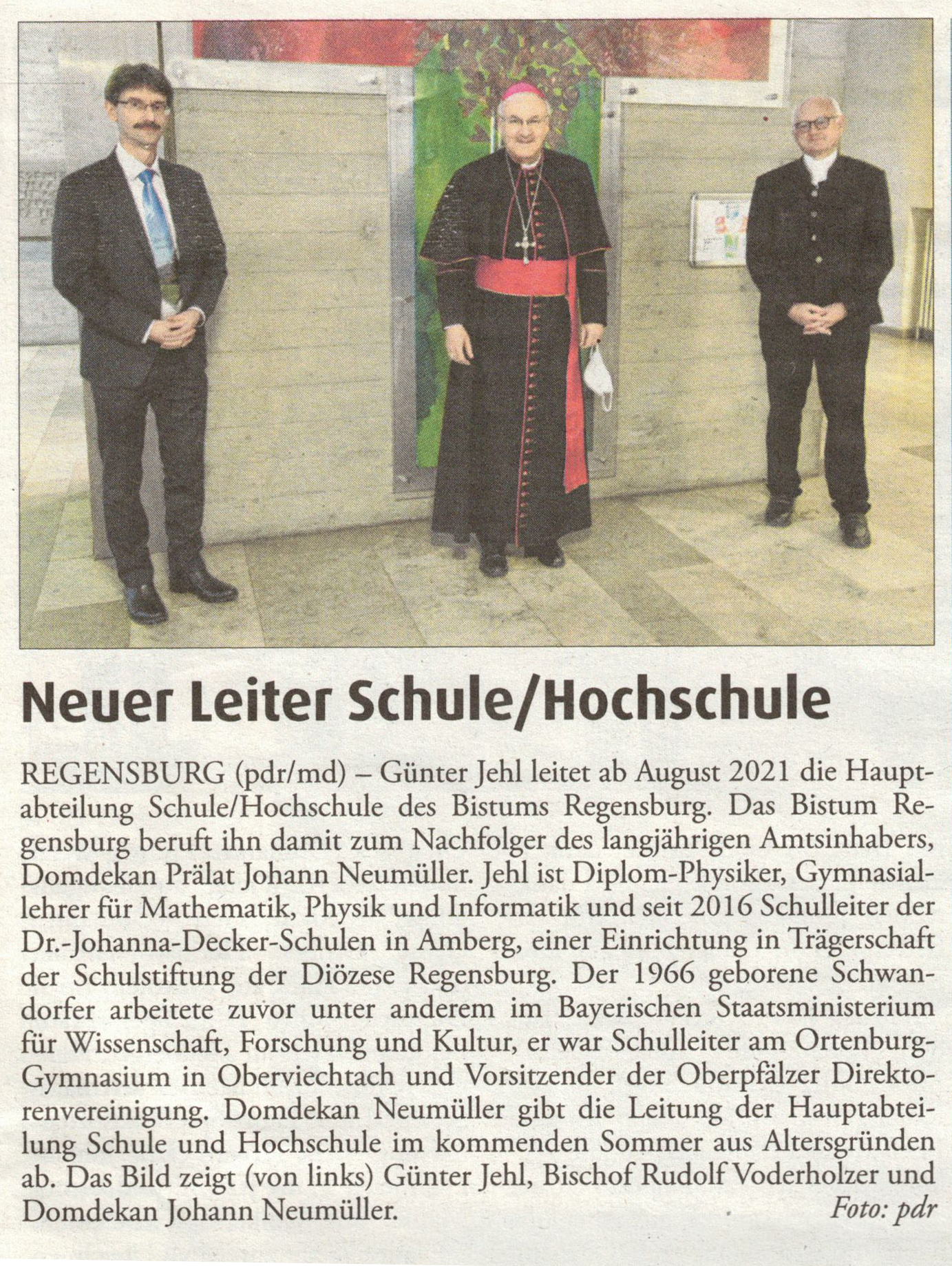 Oberstudiendirektor Günter Jehl, Schulleiter der Dr.-Johanna-Decker-Schulen in Amberg, wurde ab August 2021 zum Leiter der Hauptabteilung Schule/Hochschule des Bistums Regensburg berufen. Damit tritt er die Nachfolge des langjährigen Stiftungsdirektors der Schulstiftung der Diözese Regensburg, Domdekan Prälat Johann Neumüller, an.