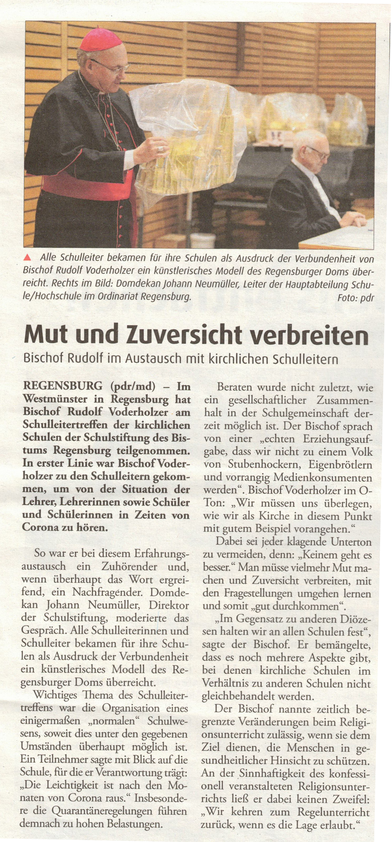 Die Schulleitertagung der kirchlichen Schulen der Diözese Regensburg fand am 11.11.2020 in Regensburg statt. Bischof Rudolf Voderholzer rief die Schulleiter/-innen dazu auf, die Herausforderungen der Corona-Pandemie mit Mut und Zuversicht zu meistern.